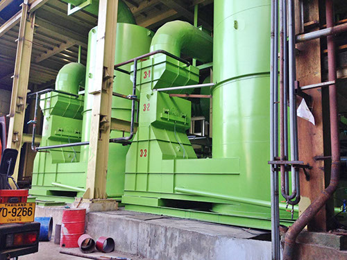 ระบบบำบัดอากาศแบบชื้น หรือ Wet scrubber ทำงานโดยอาศัย หลักการสัมผัสกันระหว่างอากาศที่มีสารปนเปื้อน เช่น ฝุ่นน้ำตาล กับของเหลว คือน้ำ โดยบังคับให้อากาศที่มีฝุ่นน้ำตาลผ่านช่องแคบ เพื่อเพิ่มความเร็วในการ ไหล ซึ่งจุดนี้เองทำให้น้ำเกิดละอองจนสามารถดักจับฝุ่นน้ำตาลได้ ผลิตภัณฑ์ Wet Scrubber ของทาง บริษัท เฮ็กซ์ซอนเอ็นจิเนียริ่ง เป็นชนิด Venturi Scrubbers ซึ่งเป็นชนิดที่ได้รับความนิยมชนิดหนึ่ง