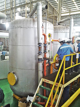 หม้อกรอง Resin เป็นหม้อกรองแรงดันสูง ใช้ในการลดสีของน้ำเชื่อมด้วยการแลกเปลี่ยนประจุ เพื่อจับยึดแร่ธาตุต่างๆที่ทำให้เกิดสี ซึ่งปะปนมากับน้ำเชื่อมไว้ น้ำเชื่อมที่ได้จากหม้อกรองนี้จะใสมาก เรียกว่า น้ำเชื่อมรีไฟน์