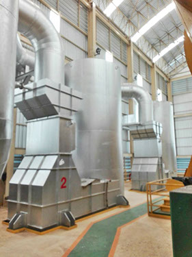 ระบบบำบัดอากาศแบบชื้น หรือ Wet scrubber ทำงานโดยอาศัย หลักการสัมผัสกันระหว่างอากาศที่มีสารปนเปื้อน เช่น ฝุ่นน้ำตาล กับของเหลว คือน้ำ โดยบังคับให้อากาศที่มีฝุ่นน้ำตาลผ่านช่องแคบ เพื่อเพิ่มความเร็วในการ ไหล ซึ่งจุดนี้เองทำให้น้ำเกิดละอองจนสามารถดักจับฝุ่นน้ำตาลได้ ผลิตภัณฑ์ Wet Scrubber ของทาง บริษัท เฮ็กซ์ซอนเอ็นจิเนียริ่ง เป็นชนิด Venturi Scrubbers ซึ่งเป็นชนิดที่ได้รับความนิยมชนิดหนึ่ง